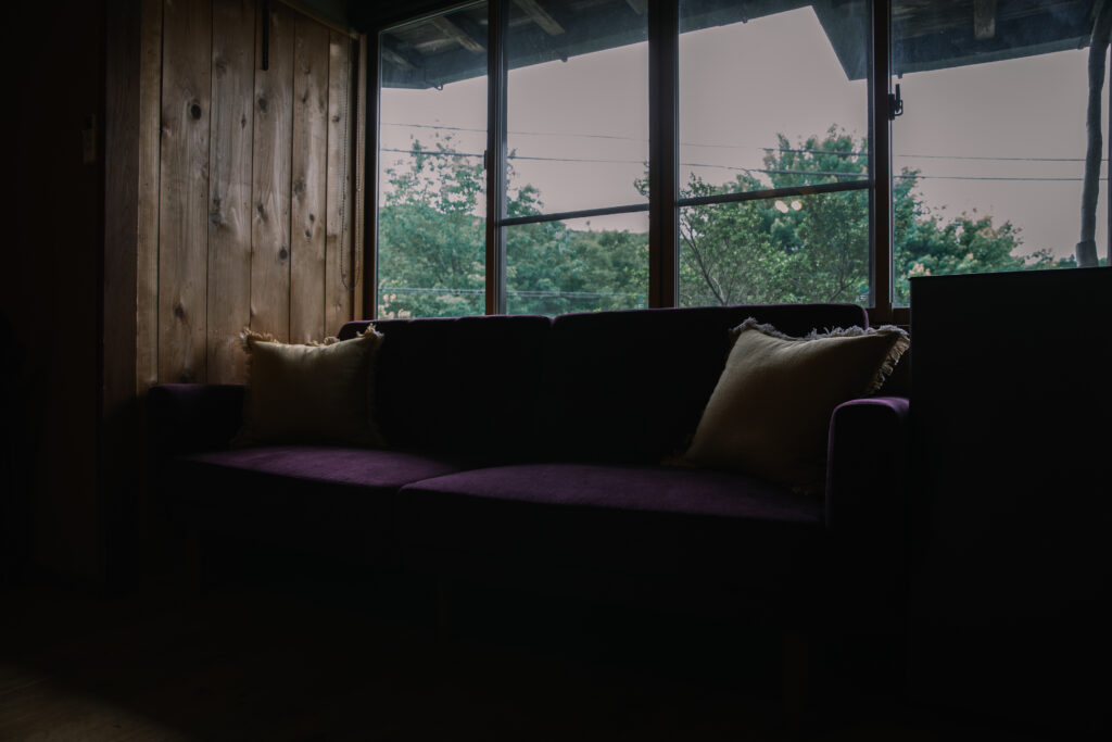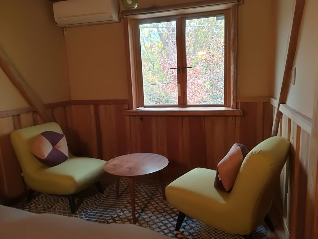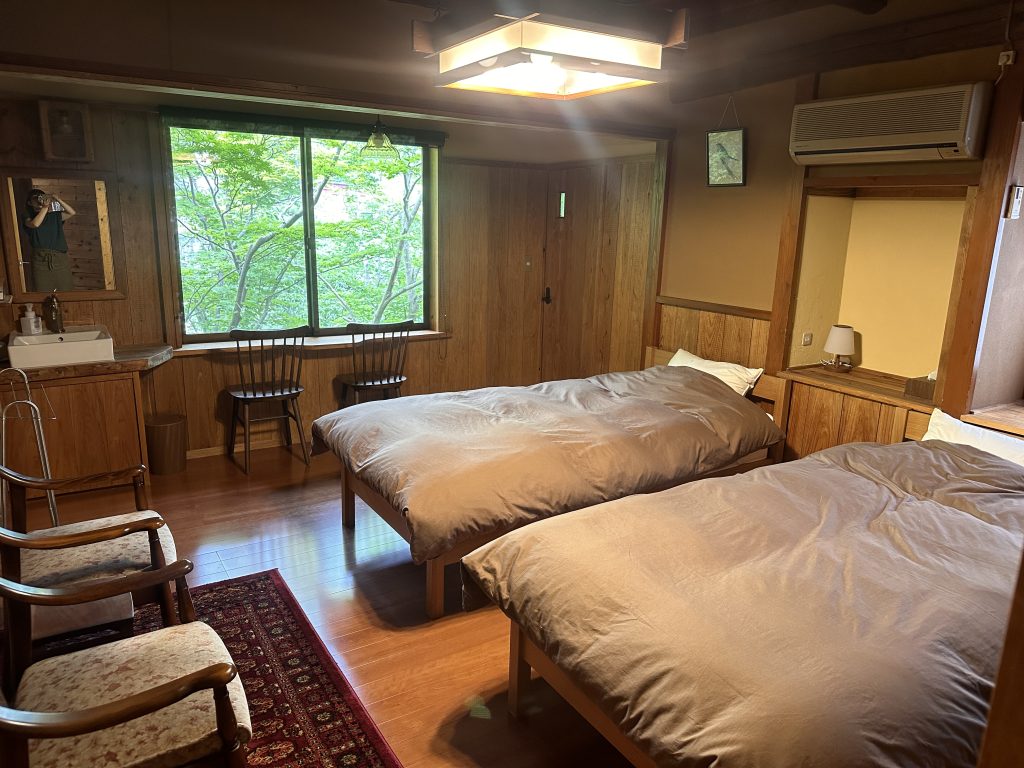2022年ごろリノベーション。フローリングにシングルベッドが2つ。黒沢川を眺めることができます。秋は紅葉が綺麗です。落葉した後は、川向こうの農家さんの作業場を遠目に眺めることができます。