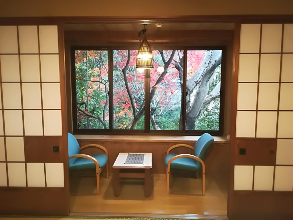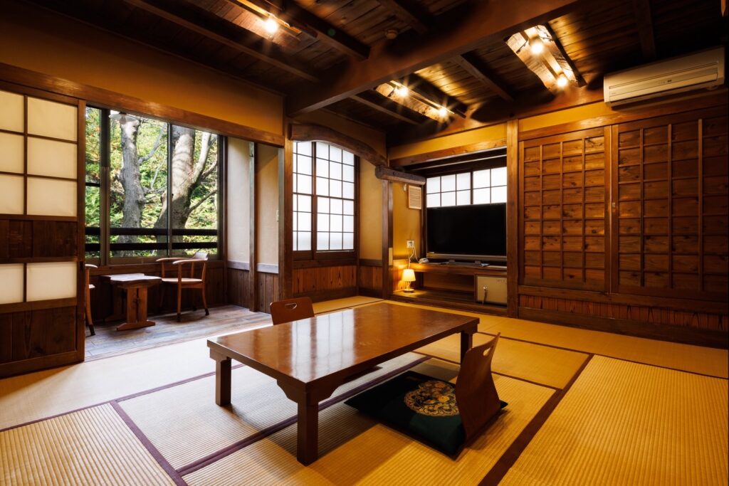 これぞ昭和のスタンダード、というような印象のTHE和室です。窓の外には黒沢川と緑を眺めることができます。※画像には灰皿が写っていますが、現在館内は完全に禁煙ですので、客室では喫煙できません。