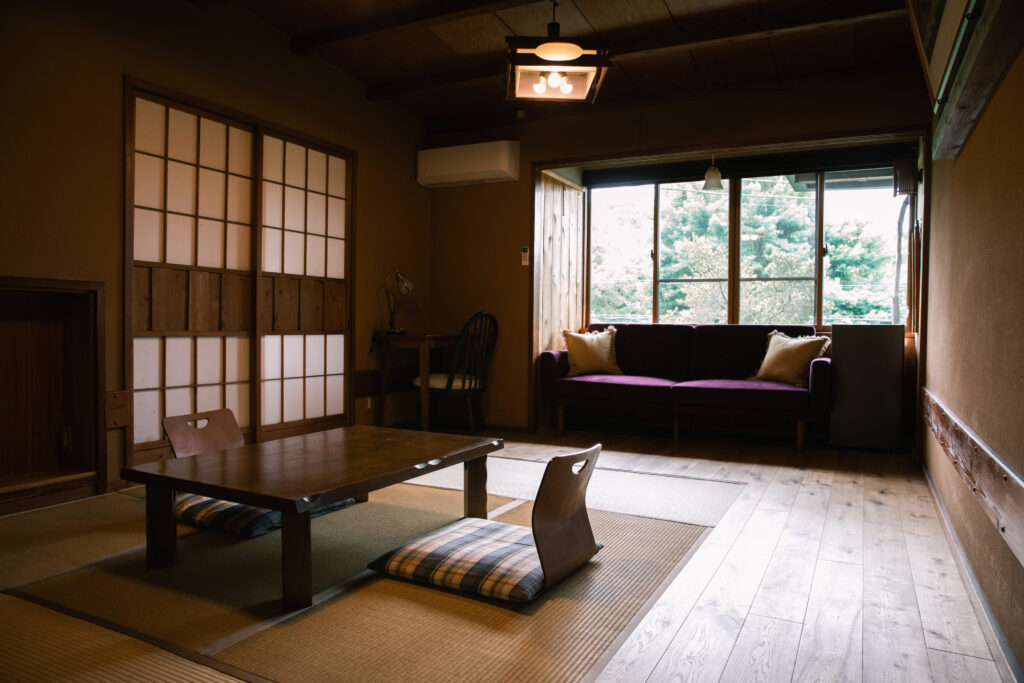 2024年にリノベーションした客室。道路側ですが、明治大正の頃はこちらが一番人気だったそうです。街道を往来する牛馬を引く商人たちを眺めながら、ほっと一息できる部屋だったのでしょう。